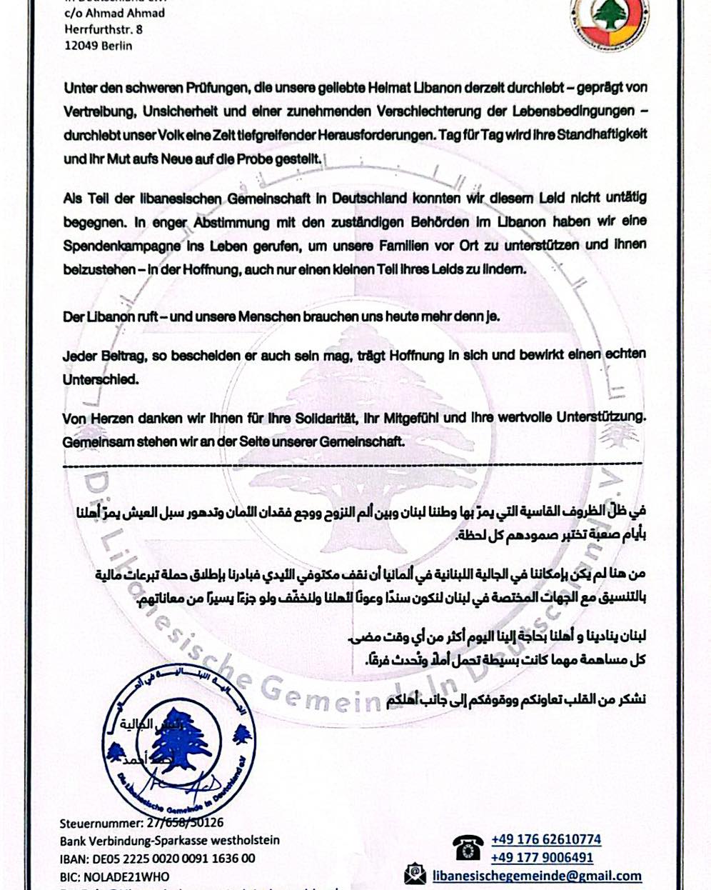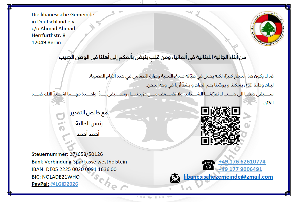 Unter den schweren Prüfungen, die unsere geliebte Heimat Libanon derzelt durchlebt - geprägt von Vertreibung, Unsicherheit und einer zunehmenden Verschlechterung der Lebensbedingungen - durchlebt unser Volk eine Zeit tiefgrelfender Herausforderungen. Tag für Tag wird Ihre Standhaftigkeit und ihr Mut aufs Neue auf die Probe gestellt.Als Teil der...