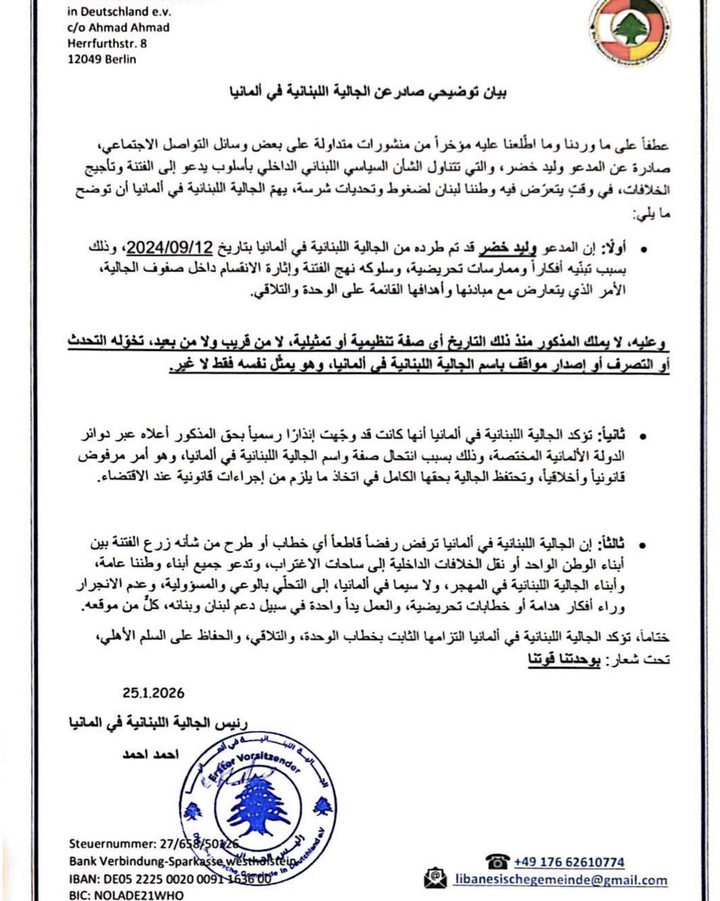 - Erstens: Walid Khodr wurde am 12. September 2024 aufgrund seiner hetzerischen Ideen und Praktiken sowie seines spaltenden und aufrührerischen Verhaltens innerhalb der Gemeinschaft, das deren auf Einheit und Zusammenhalt basierenden Prinzipien und Zielen widerspricht, aus der libanesischen Gemeinschaft in Deutschland ausgeschlossen.